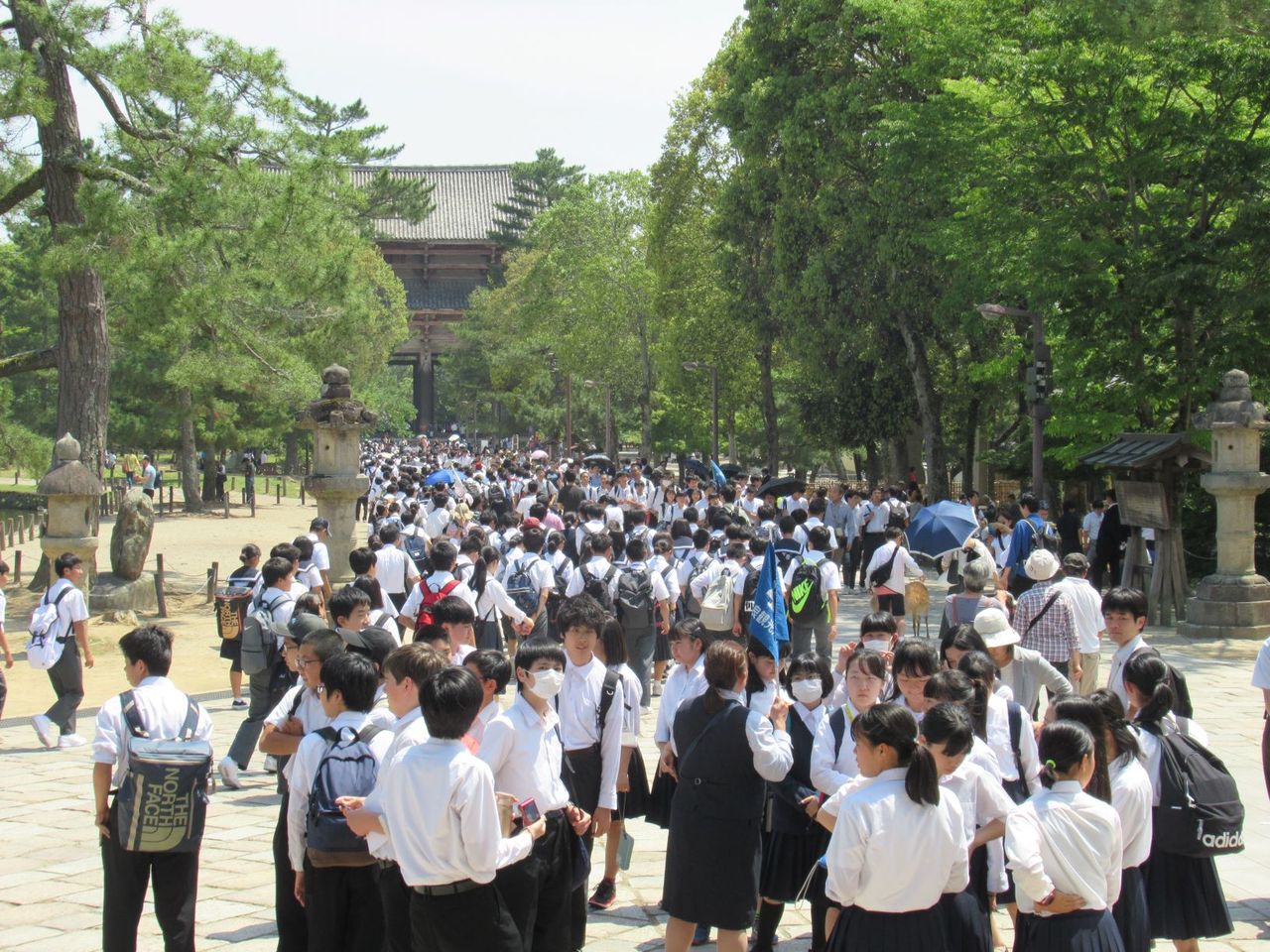 残念ながら屋上は工事中で若草山側には行けませんでしたが、興福寺や大極殿は見えます。ここで少し身体を休め、軽く食事をしながらも会話は止まりません。ここはまだ中間地点、休んだ身体からギアを入れるため、ストレッチして再スタート。奈良公園に入ると、そこは人・人・人! ものすごい観光客の数です。