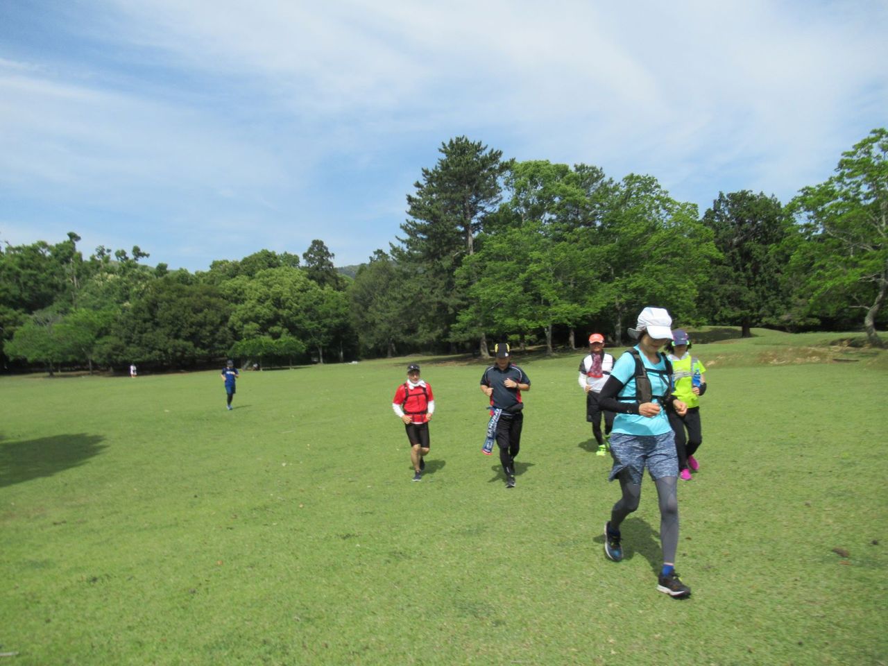 集合してランニング再開! といってもすぐに歩き。若草山の麓まで行きますと、緑の芝生と青空のコントラストが抜群です!