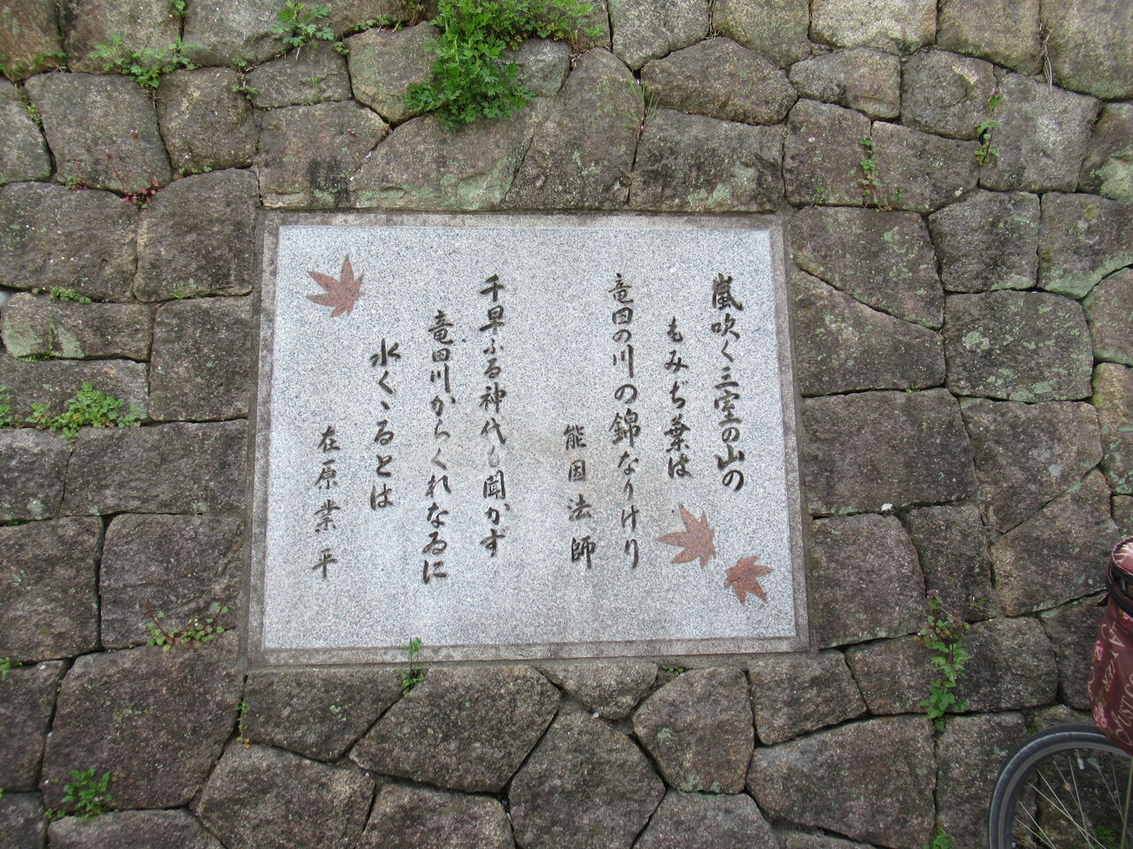 百人一首「ちはやふる~」の歌碑があり、竜田川として一番有名な場所「三室山(みむろやま)」だ。階段を上がって山を歩いて登る。今日一番の人出がここだ。桜吹雪がとても綺麗と言いたかったが、風が強くなり、花弁が飛んでいく。三角点「82m」の低山だ。