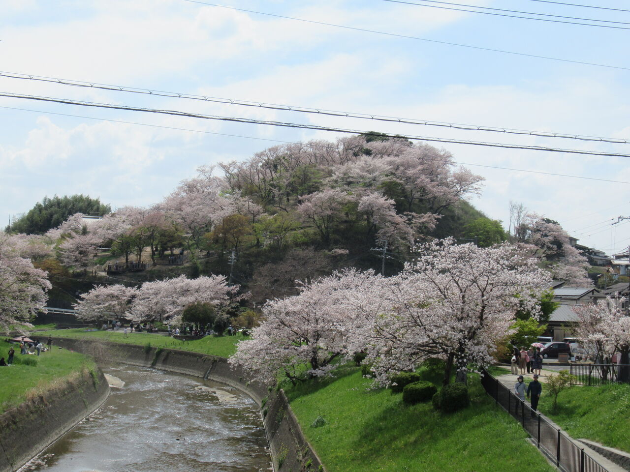 「平群駅」「竜田川駅」の近くを通り過ぎ、信号を渡ると竜田公園へ入る。ここは紅葉で有名だが、桜も綺麗なことはあまり知られていない。公園で小休止した後、南の端へ走り抜けると急に人が増えてきた。三室山が見える橋までやってきたところで約14km。さすがにここの桜は有名だから人が集まっている。こんもりした丘のような山に、満開の桜が青空の下で咲き誇っている。