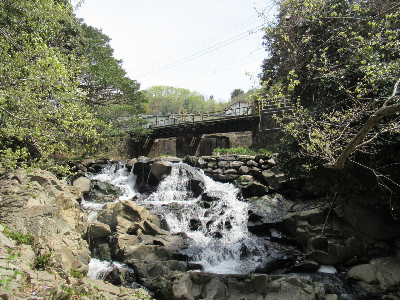 階段を上がると電車のトンネルが見える。スタートから約7.5km、普通は気付かない「けもの道」を入って行くと、川を流れる水の音がさらに大きくなり、目の前に滝が現れる。ここが一番案内したかった秘境だ。足元の悪い中、滝を目指して降りて行く。岩に水が叩き付ける音が激しくなり、水しぶきが体に当たるところまで近寄ると、その光景は圧巻だ。(2018年の映像あり)