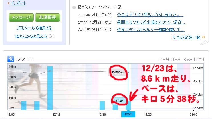 12/23は、8.6km走り、ペースはキロ5分38秒です。