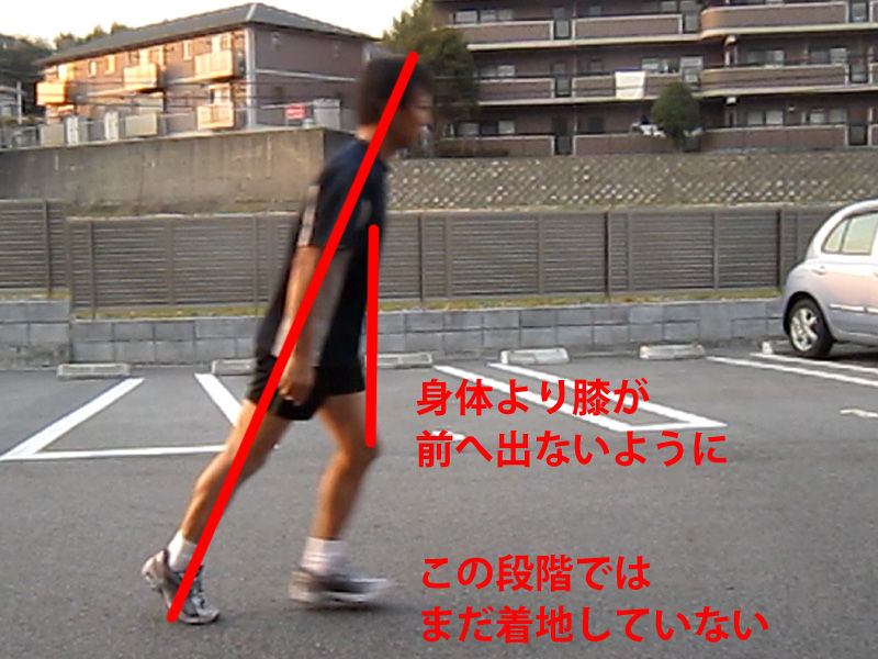 足が前へ出る時、膝を前へ出し過ぎないように注意します。