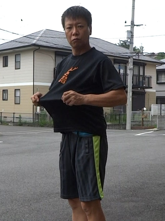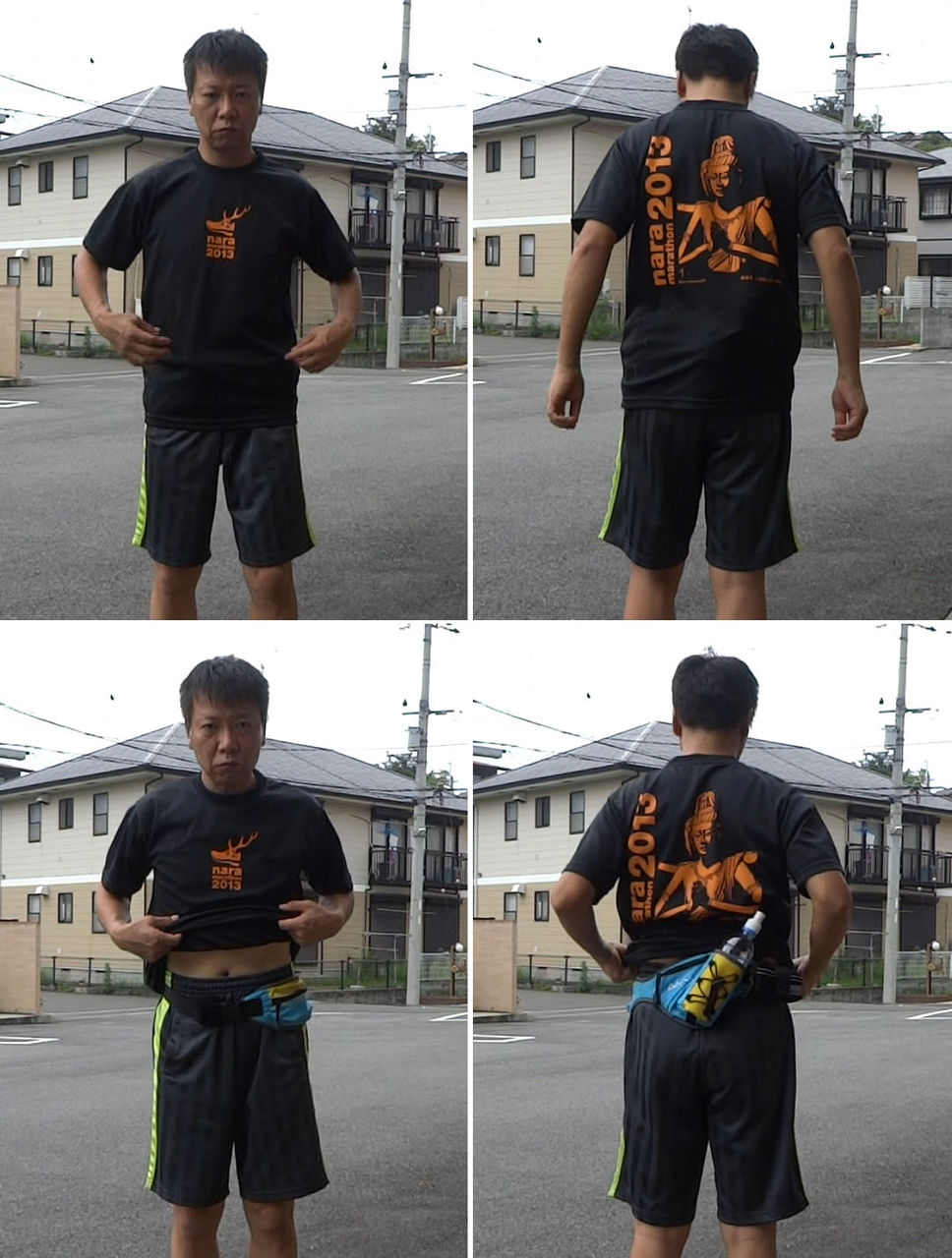 私はこのように、Tシャツの下にボトルポーチを巻きます。