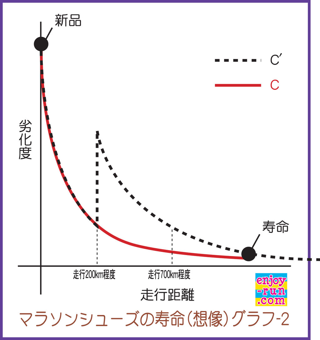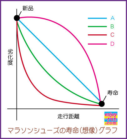 上の図は以前書いた記事に貼りつけた、マラソンシューズの寿命の想像図です。あくまでも想像線を描いたのですが、あとでシューズメーカーさんに聞きましたら、「Cに近い」と言われました。ギュ~ンと劣化してから、ある程度保つそうです。そのギュ~ンと劣化するのはだいたい100~200kmくらいだ、とも言われました。