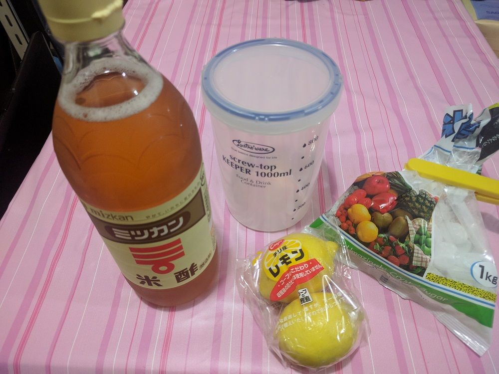 原液の材料=米酢400cc、レモン2個、氷砂糖180g、1000ml容器(レンジ対応)